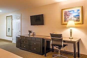 This room features a flat-screen cable TV, a refrigerator and a coffee machine.